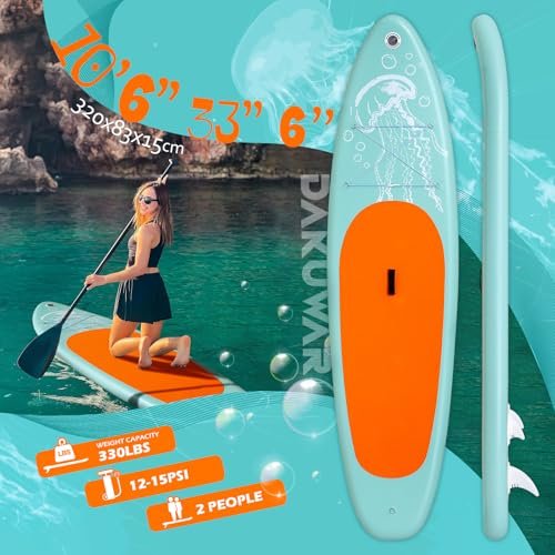 - 【Lightweight SUP Design】DAKUWAR paddle boards are made from ultra-light, high-quality double-walled PVC, which is easy to carry with your journey. The paddleboard’s standard size is 10’6″ x 33″ x 6″, with a load capacity of 330 lbs