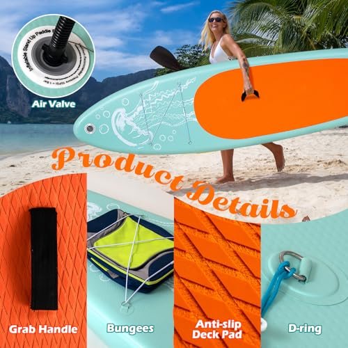 - 【Anti-slip Deck Pad】The inflatable SUP board features a wide non-slip deck pad for enhanced grip, ensuring maximum safety and comfort while paddling