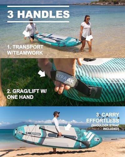 - 𝟭𝟵.𝟴𝗟𝗕 𝗣𝗢𝗥𝗧𝗔𝗕𝗟𝗘 𝗕𝗨𝗡𝗗𝗟𝗘+𝟯 𝗠𝗨𝗟𝗧𝗜-𝗙𝗨𝗡𝗖𝗧𝗜𝗢𝗡𝗔𝗟 𝗛𝗔𝗡𝗗𝗟𝗘𝗦: FLYPARK extra wide paddleboard is exceptionally lightweight for one person to carry. It’s three strategically placed handles add flexibility to transport: the front and rear handles allow two people to lift the board together, while the center handle is designed for balance bearing.