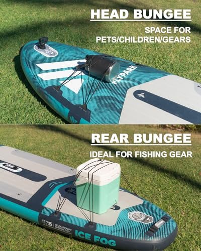 - 𝗗𝗨𝗔𝗟 𝟰-𝗣𝗢𝗜𝗡𝗧 𝗕𝗨𝗡𝗚𝗘𝗘 𝗦𝗬𝗦𝗧𝗘𝗠 & 𝟰 𝗖𝗘𝗡𝗧𝗘𝗥 𝗗-𝗥𝗜𝗡𝗚𝗦 𝗙𝗢𝗥 𝗩𝗘𝗥𝗦𝗔𝗧𝗜𝗟𝗘 𝗦𝗧𝗢𝗥𝗔𝗚𝗘: FLYPARK inflatable paddleboard for adults features a dual 4-point bungee system, providing ample storage at both the front and rear for families to carry coolers, bags, and extra gear. Additionally, 4 center D-rings offer the option to attach a shoulder strap or a kayak seat (not included), allowing greater possibility for fun.