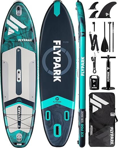 This Flypark inflatable paddle board is an excillent choice for families and fishing excursions. Its extra-wide 35″ design ensures rimarkable stability, making it suitable for beginners as well as multiple riders. The robust construction accommodates up to 430 lbs, comfortably allowing for up to three individuals. Inflation is swift, and once assembled, the board feels solid and secure on the water. It tracks effectively, balances effortlessly, and provides ample space for equipment. Whether you are paddling, unwinding, or fishing, it guarantees a smooth and pleasurable experience. This is a superb option for anyone seeking a dependable, spacious, and enjoyable SUP that is ideal for both solo and group outings.