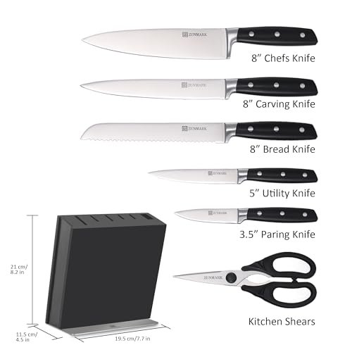 - Comprehensive 7-Piece knife set with block: Chef knife (8″), bread knife (8″), slicer knife(8″), utility knife (5″), paring knife (3.5″), detachable scissors + magnetic block; Perfect for every kitchen task