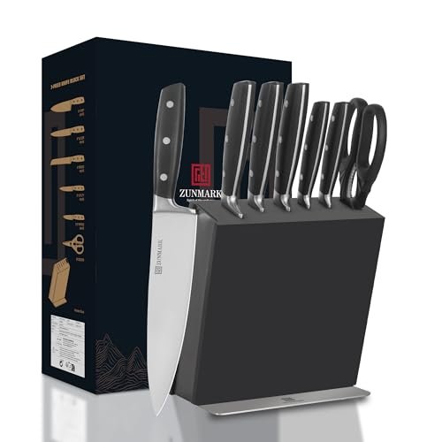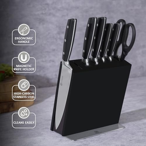 Really impressed with this 7-piece knife set. The solid wood block with the one sided magnetic design looks modern and saves space on the counter. The knives are sharp right out of the box and feel sturdy thanks to the full-tang stainless steel build .