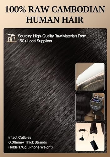 - 100% CAMBODIAN RAW HUMAN HAIR — Natural black, unprocessed, cuticles aligned. Strand diameter >0.07 mm for a thicker, resilient feel; elasticity verified by a ~170 g pull test. Bounce after multiple washes