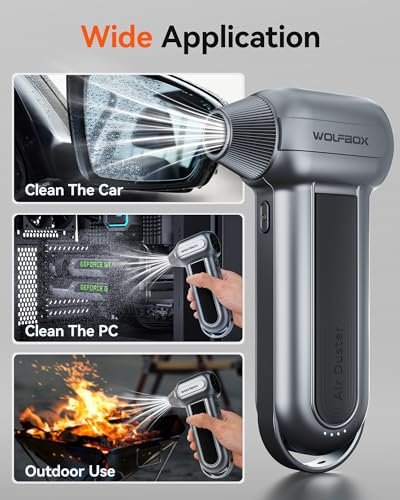 - Versatile Cleaning Tool: Featuring 5 nozzles and 2 brushes, the WOLFBOX electric air duster is perfect for cleaning electronics like PCs and keyboards, as well as for home, car, and outdoor use. It’s also great for inflating gear or managing campfires, making it a must-have for multiple scenarios.